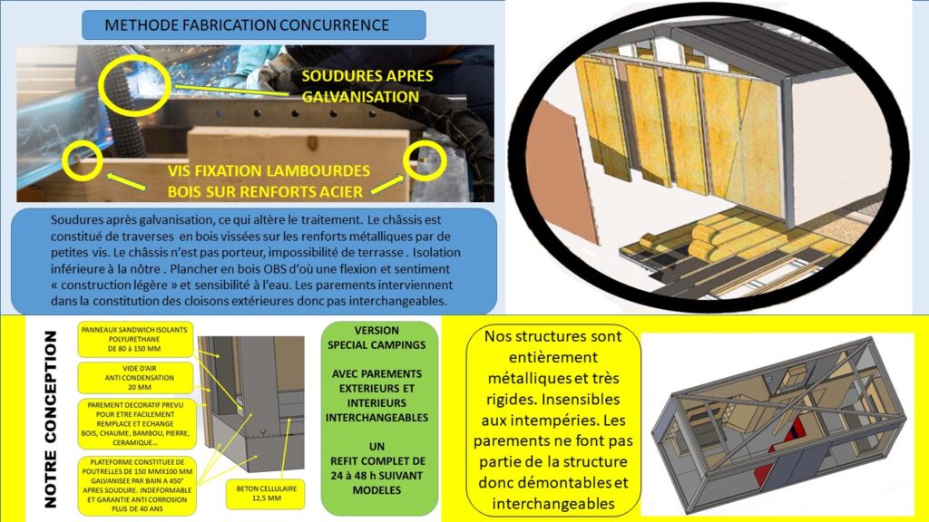 La particularité de nos mobil homes est leur adaptabilité. De plus ils possèdent une ossature en poutres d’acier galvanisés après soudures ce qui protège les structures pour de longues décennies sans aucun entretien.
